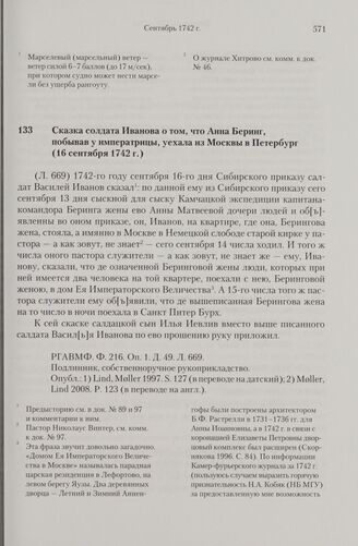 Сказка солдата Иванова о том, что Анна Беринг, побывав у императрицы, уехала из Москвы в Петербург. 16 сентября 1742 г. // РГАВМФ. Ф. 216. Оп. 1. Д. 49. Л. 669. Lind, Мøllег, 1997. S. 127. Мøllег, Lind, 2008. Р. 123.