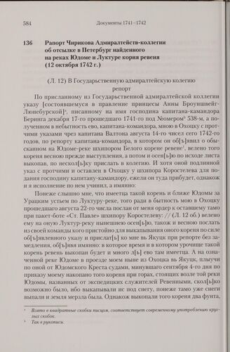 Рапорт Чирикова Адмиралтейств-коллегии об отсылке в Петербург найденного на реках Юдоме и Луктуре корня ревеня. 12 октября 1742 г.