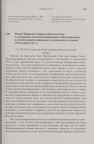 Рапорт Чирикова Адмиралтейств-коллегии о содержании экспедиционной церкви в Петропавловске и о необходимости присылки туда грамотного человека. 18 октября 1742 г. // РГАВМФ. Ф. 216. Оп. 1. Д. 52. Л. 10-10 об.