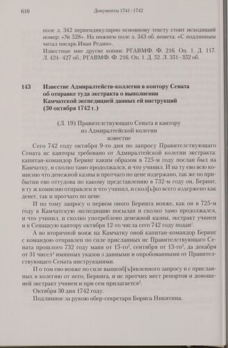 Известие Адмиралтейств-коллегии в контору Сената об отправке туда экстракта о выполнении Камчатской экспедицией данных ей инструкций. 30 октября 1742 г. // РГАВМФ. Ф. 212. Оп. 11. Д. 794. Л. 19-19 об.