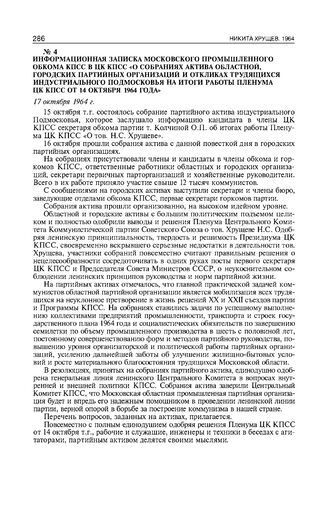 Информационная записка Московского промышленного обкома КПСС в ЦК КПСС «О собраниях актива областной, городских партийных организаций и откликах трудящихся индустриального подмосковья на итоги работы пленума ЦК КПСС от 14 октября 1964 года». 17 октября 1964 г.