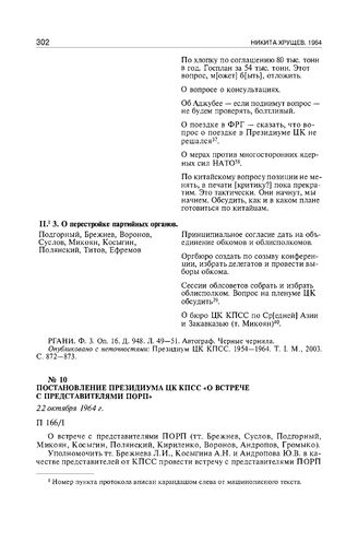 Постановление Президиума ЦК КПСС «О встрече с представителями ПОРП». 22 октября 1964 г.