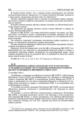 Главная Серия «Россия. XX век. Документы» Никита Хрущев. 1964. Стенограммы пленумов ЦК КПСС и другие документы Информационная записка посольства СССР в ГДР в ЦК КПСС «О реакции н...