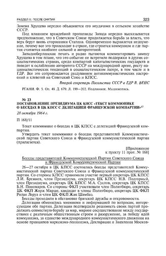 Постановление Президиума ЦК КПСС «Текст коммюнике о беседах в ЦК КПСС с делегацией французской компартии». 28 октября 1964 г. // РГАНИ. Ф. 3. Оп. 18. Д. 292. Л. 5, 21. Подлинник. Машинопись.