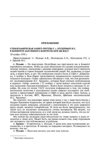 Стенографическая запись беседы с т. Хрущевым Н.С. в Комитете партийного контроля при ЦК КПСС. 10 ноября 1970 г.