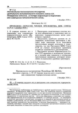 Протокольное постановление Президиума Центрального исполнительного комитета Союза ССР, проведенное опросом, «О порядке ведения дел о подготовке или совершении террористических актов». 1 декабря 1934 г. // ГАРФ. Ф. 3316. Оп. 12. Д. 516. Л. 4. Подлинник. Опубликовано: Правда. № 333 (6219). 4 декабря 1934 г.