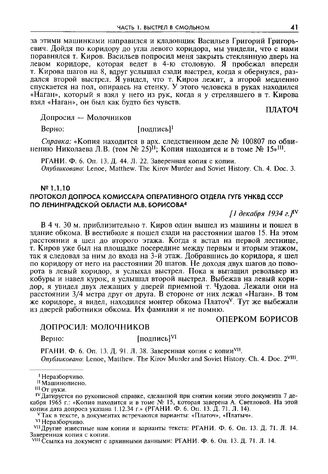 Протокол допроса комиссара оперативного отдела ГУГБ УНКВД СССР по Ленинградской области М.В. Борисова. [1 декабря 1934 г.] // РГАНИ. Ф. 6. Оп. 13. Д. 91. Л. 38. Заверенная копия с копии. Опубликовано: Lenoe, Matthew. The Kirov Murder and Soviet History. Ch. 4. Doc. 2.