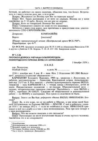 Протокол допроса учетчицы культпропотдела Ленинградского горкома ВКП(б) Е.П. Кармановой. 1 декабря 1934 г., гор. Ленинград