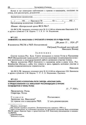 Заявление Л.В. Николаева с просьбой о приеме его в ряды РКП(б). [Не ранее 13 ... 1924 г.] // ЦА ФСБ РФ. Архивное уголовное дело № Н-11144 по обвинению Л.В. Николаева и других в убийстве С.М. Кирова. Т. 37. Л. 55. Подлинник. Рукопись.