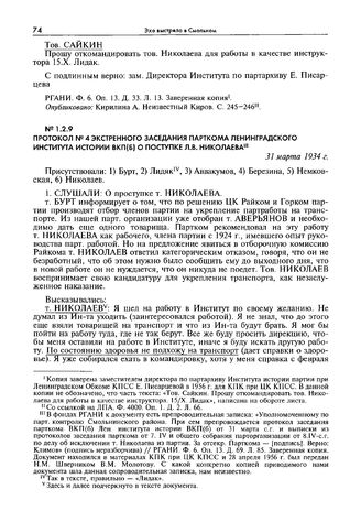 Протокол № 4 экстренного заседания парткома Ленинградского института истории ВКП(б) о поступке Л.В. Николаева. 31 марта 1934 г. // ЦА ФСБ РФ. Архивное уголовное дело № Н-11144 по обвинению Николаева Л.В. и других в убийстве С.М. Кирова. Т. 24. Л. 318—319. Заверенная копия.