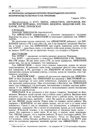 Из протокола заседания парткома Ленинградского института истории ВКП(б) по вопросу о Л.В. Николаеве. 7 апреля 1934 г. // ЦА ФСБ РФ. Архивное уголовное дело № Н-11144 по обвинению Николаева Л.В. и других в убийстве С.М. Кирова. Т. 24. Л. 325—326. Выписка из протокола.