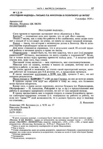 «Последняя надежда»: письмо Л.В. Николаева в Политбюро ЦК ВКП(б). 9 октября 1934 г., Ленинград // ЦА ФСБ РФ. Архивное уголовное дело № Н-11144 по обвинению Николаева Л.В. и других в убийстве С.М. Кирова. Т. 5. Л. 178—180. Рукопись. Подлинник. Опубликовано: Lenoe, Matthew. The Kirov Murder and Soviet History. Ch. 6. Doc. 26.