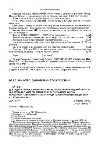 Докладная записка начальника УНКВД СССР по Ленинградской области Ф.Д. Медведя о ходе следствия по делу об убийстве Кирова, переданная телеграммой из Ленинграда наркому внутренних дел СССР Г.Г. Ягоде в Москву. 2 декабря 1934 г. // РГАНИ. Ф. 6. Оп. 13. Д. 71. Л. 2. Фотокопия. Опубликовано: Lenoe, Matthew. The Kirov Murder and Soviet History. Ch. 4. Doc. 14.