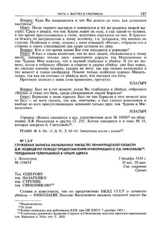 Служебная записка начальника УНКВД по Ленинградской области Д.Ф. Медведя по поводу предоставления информации о Л.В. Николаеве, переданная телеграммой в четыре адреса. Г. Ленинград, 3 декабря 1934 г. // РГАНИ. Ф. 6. Оп. 13. Д. 69. Л. 136. Заверенная копия с копии. Опубликовано: Кирилина А. Неизвестный Киров. С. 264.