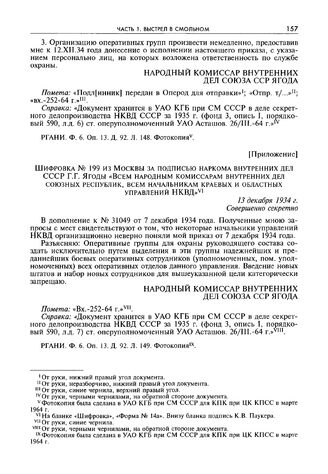 Приложение к записке наркома внутренних дел СССР Г.Г. Ягоды от 7 декабря 1934 г. Шифровка № 199 из Москвы за подписью наркома внутренних дел СССР Г.Г. Ягоды «Всем народным комиссарам внутренних дел союзных республик, всем начальникам краевых и областных управлений НКВД». 13 декабря 1934 г.