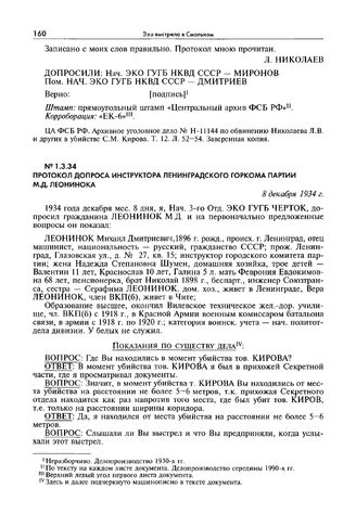Протокол допроса инструктора Ленинградского горкома партии М.Д. Леонинока. 8 декабря 1934 г. // ЦА ФСБ РФ. Архивное уголовное дело № Н-11144 по обвинению Николаева Л.В. и других по обвинению в убийстве С.М. Кирова. Т. 24. Л. 114—118. Заверенная копия.