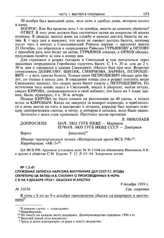Служебная записка наркома внутренних дел СССР Г.Г. Ягоды секретарю ЦК ВКП(б) И.В. Сталину о произведенных в ночь с 8 на 9 декабря 1934 г. обысках и арестах. 9 декабря 1934 г. // АП РФ. Ф. 3. Оп. 24. Д. 197. Л. 117—118. Подлинник.