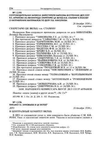 Сопроводительная записка заместителя наркома внутренних дел СССР Я.С. Агранова из Ленинграда секретарю ЦК ВКП(б) И.В. Сталину в Москву о направлении материалов по делу Л.В. Николаева. 26 декабря 1934 г.