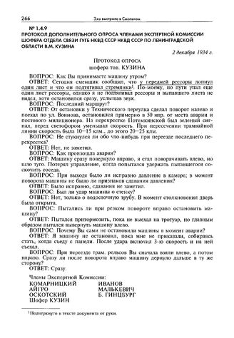 Протокол дополнительного опроса членами экспертной комиссии шофера отдела связи ГУГБ НКВД СССР НКВД СССР по Ленинградской области В.М. Кузина. 2 декабря 1934 г. // ЦА ФСБ РФ. Архивное уголовное дело № Н-11144 по обвинению Николаева Л.В. и других в убийстве С.М. Кирова. Т. 24. Л. 260. Заверенная копия.