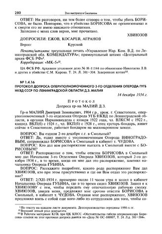 Протокол допроса оперуполномоченного 3-го отделения оперода ГУГБ НКВД СССР по Ленинградской области Д.З. Малия. 14 декабря 1934 г. // ЦА ФСБ РФ. Архивное уголовное дело № Н-11144 по обвинению Николаева Л.В. и других в убийстве С.М. Кирова. Т. 24. Л. 296—300. Заверенная копия.