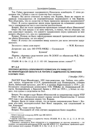 Протокол допроса оперативного комиссара УГБ УНКВД СССР по Ленинградской области К.М. Паузера о задержании Л.В. Николаева в октябре 1934 г. 5 декабря 1934 г. // РГАНИ. Ф. 6. Оп. 13. Д. 13. Л. 76—79. Заверенная копия с копии. Опубликовано: Lenoe, Matthew. The Kirov Murder and Soviet History. Ch. 10. Doc. 86.