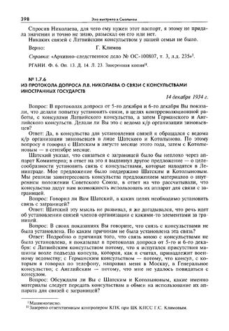 Из протокола допроса Л.В. Николаева о связи с консульствами иностранных государств. 14 декабря 1934 г. // РГАНИ. Ф. 6. Оп. 13. Д. 14. Л. 24—25. Заверенная копия.