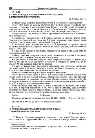 Из протокола допроса Л.В. Николаева о его связи с латвийским консульством. 25 декабря 1934 г. // РГАНИ. Ф. 6. Оп. 13. Д. 14. Л. 30. Заверенная копия.