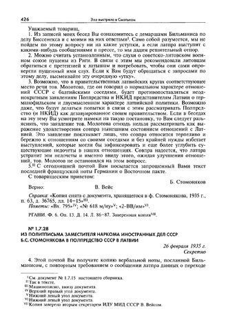 Из политписьма заместителя наркома иностранных дел СССР Б.С. Стомонякова в полпредство СССР в Латвии. 26 февраля 1935 г.