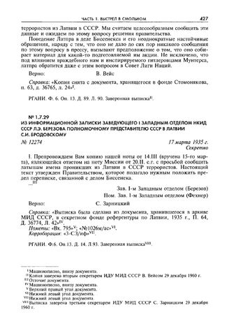 Из информационной записки заведующего I западным отделом НКИД СССР Л.Э. Березова полномочному представителю СССР в Латвии С.И. Бродовскому. 17 марта 1935 г. // РГАНИ. Ф. 6. Оп. 13. Д. 14. Л. 93. Заверенная выписка.