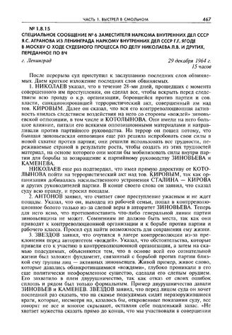 Специальное сообщение № 6 заместителя наркома внутренних дел СССР Я.С. Агранова из Ленинграда наркому внутренних дел СССР Г.Г. Ягоде в Москву о ходе судебного процесса по делу Николаева Л.В. и других, переданное по ВЧ. Г. Ленинград, 29 декабря 1964 г.