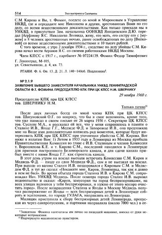 Заявление бывшего заместителя начальника УНКВД Ленинградской области Ф.Т. Фомина председателю КПК при ЦК КПСС Н.М. Швернику. Ленинград, 29 ноября 1960 г. // РГАНИ. Ф. 6. Оп. 13. Д. 71. Л. 135—139. Подлинник