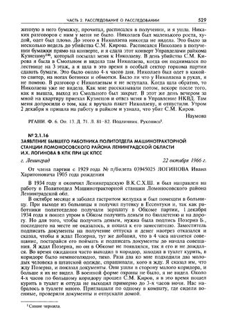 Заявление бывшего работника политотдела машинотракторной станции Ломоносовского района Ленинградской области И.Х. Логинова в КПК при ЦК КПСС. Г. Ленинград, 22 октября 1966 г. // РГАНИ. Ф. 6. Оп. 13. Д. 71. Л. 87—88об. Подлинник. Машинопись, частично рукопись.