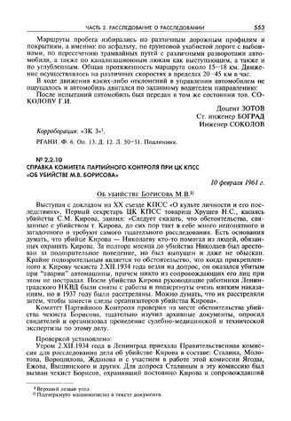 Справка Комитета партийного контроля при ЦК КПСС «Об убийстве М.В. Борисова». 10 февраля 1961 г.