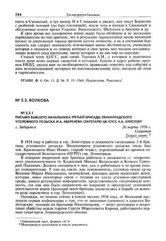 Письмо бывшего начальника третьей бригады Ленинградского уголовного розыска И.А. Аверкиева секретарю ЦК КПСС А.Б. Аристову. Г. Хабаровск, 26 марта 1956 г. // РГАНИ. Ф. 6. Оп. 13. Д. 44. Л. 36—47. Копия.