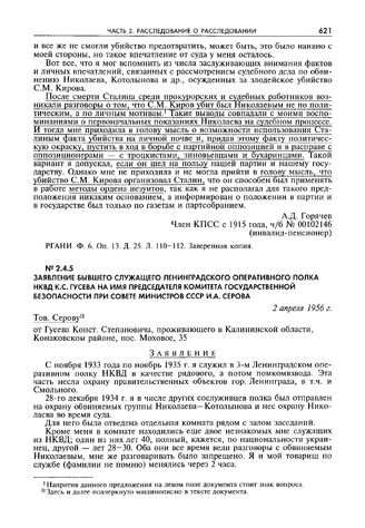 Заявление бывшего служащего Ленинградского оперативного полка НКВД К.С. Гусева на имя председателя Комитета государственной безопасности при Совете министров СССР И.А. Серова. 2 апреля 1956 г. // РГАНИ. Ф. 6. Оп. 13. Д. 24. Л. 80—81. Заверенная копия.