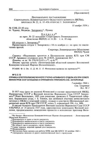 Приложение к письму В.Д. Запорожец в КПК при ЦК КПСС от 9 июля 1964 г. Протокольное постановление Секретариата Ленинградского Областного комитета ВКП(б), протокол № 22, п. 10 «Об отпуске т. Запорожца». 11 ноября 1934 г.