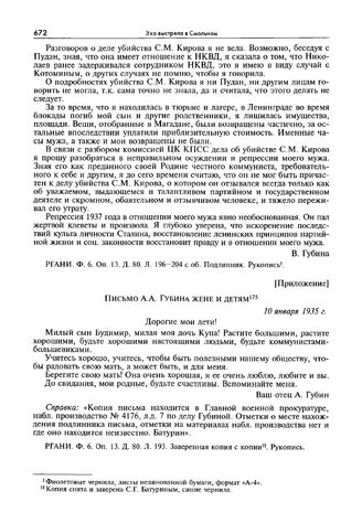 Приложение к объяснениям, направленным В.И. Губиной в КПК при ЦК КПСС от 10 октября 1964 г. Письмо А.А. Губина жене и детям. 10 января 1935 г. // РГАНИ. Ф. 6. Оп. 13. Д. 80. Л. 193. Заверенная копия с копии. Рукопись.