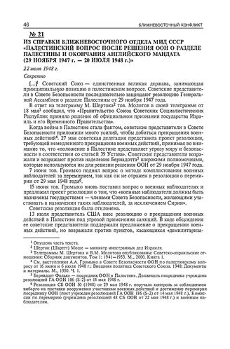 Из справки Ближневосточного отдела МИД СССР «Палестинский вопрос после решения ООН о разделе Палестины и окончания английского мандата (29 ноября 1947 г. - 20 июля 1948 г.). 22 июля 1948 г.