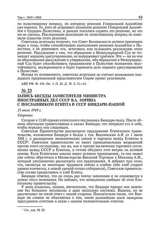 Запись беседы заместителя министра иностранных дел СССР В.А. Зорина с посланником Египта в СССР Биндари-пашой. 31 июля 1948 г. // АВП РФ. Ф. 021. Оп. 2. П. 1. Д. 4. Л. 107-108.