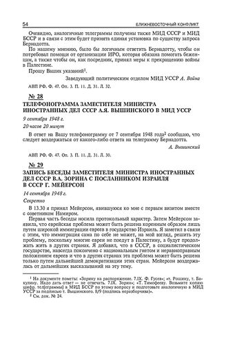Запись беседы заместителя министра иностранных дел СССР В.А. Зорина с посланником Израиля в СССР Г. Мейерсон. 14 сентября 1948 г. // АВП РФ. Ф. 07. Оп. 21. П. 4. Д. 61. Л. 19-21.