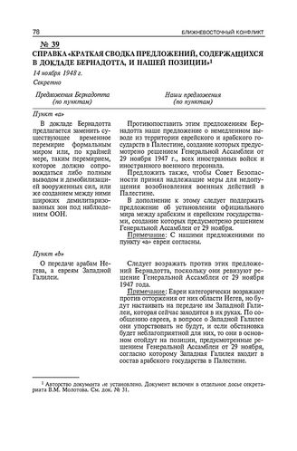 Справка «Краткая сводка предложений, содержащихся в докладе Бернадотта, и нашей позиции». 14 ноября 1948 г. // АВП РФ. Ф. 07. Оп. 21в. П. 49. Д. 39. Л. 148-153.