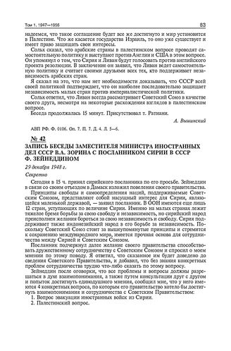 Запись беседы заместителя министра иностранных дел СССР В.А. Зорина с посланником Сирии в СССР Ф. Зейнеддином. 29 декабря 1948 г. // АВП РФ. Ф. 021. Оп. 9. П. 1. Л. 5-7.