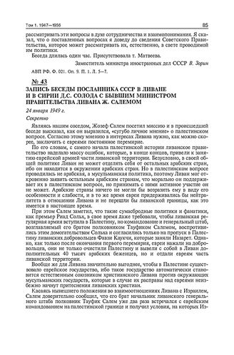 Запись беседы посланника СССР в Ливане и в Сирии Д.С. Солода с бывшим министром правительства Ливана Ж. Салемом. 24 января 1949 г.
