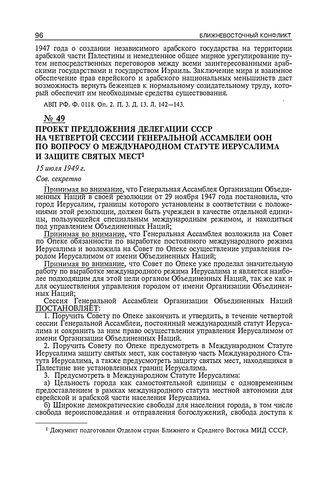 Проект предложения делегации СССР на четвертой сессии Генеральной Ассамблеи ООН по вопросу о международном статуте Иерусалима и защите святых мест. 15 июля 1949 г. // АВП РФ. Ф. 0118. Оп. 2. П. 3. Д. 13. Л. 132-134.