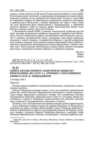 Запись беседы первого заместителя министра иностранных дел СССР А.А. Громыко с посланником Сирии в СССР Ф. Зейнеддином. 5 октября 1949 г. // АВП РФ. Ф. 0128. Оп. 12. П. 10. Д. 4. Л. 9-10.
