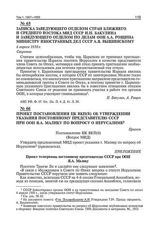 Записка заведующего отделом стран Ближнего и Среднего Востока МИД СССР И.Н. Бакулина и заведующего отделом по делам ООН А.А. Рощина министру иностранных дел СССР А.Я. Вышинскому. 6 апреля 1950 г. // АВП РФ. Ф. 07. Оп. 23а. П. 4. Д. 41. Л. 34.