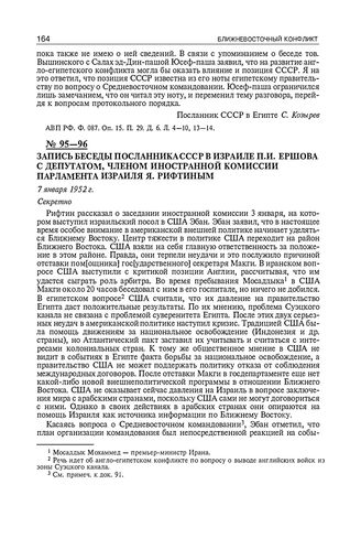 Запись беседы посланника СССР в Израиле П.И. Ершова с депутатом, членом иностранной комиссии парламента Израиля Я. Рифтиным. 7 января 1952 г. // АВП РФ. Ф. 089. Оп. 5. П. 11. Д. 7. Л. 19-22.