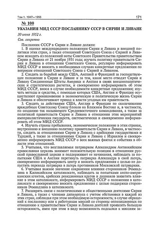 Указания МИД СССР посланнику СССР в Сирии и Ливане. 30 июня 1952 г.