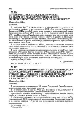 Служебная записка заведующего отделом по делам ООН МИД СССР В.Г. Трухановского министру иностранных дел СССР А.Я. Вышинскому. 15 сентября 1952 г.