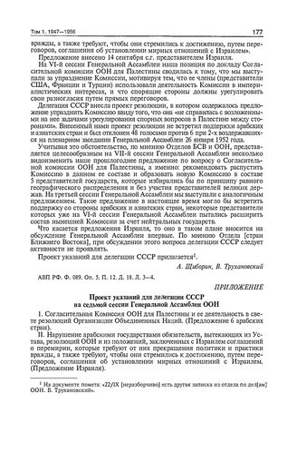 Приложение к записке заведующего отделом по делам ООН МИД СССР В.Г. Трухановского и заместителя заведующего отделом стран Ближнего и Среднего Востока МИД СССР А.Д. Щиборина. Проект указаний для делегации СССР на седьмой сессии Генеральной Ассамблеи ООН // АВП РФ. Ф. 089. Оп. 5. П. 12. Д. 18. Л. 5-6.